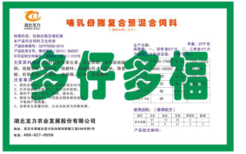 湖北龍力農(nóng)業(yè)發(fā)展股份有限公司坐落于武漢市黃陂區(qū)前川街向陽街群順三里298號(hào)附1號(hào)。公司成立于2014年6月,公司自成立以來把“創(chuàng)全球最大養(yǎng)豬綜合服務(wù)”為企業(yè)愿景。致力于打造教保料品牌”作為公司發(fā)展的明確目標(biāo)。公司一直致力于豬營養(yǎng)的研究和開發(fā),積極與國內(nèi)外高校和科研機(jī)構(gòu)合作,推廣養(yǎng)豬技術(shù)、動(dòng)物營養(yǎng)新概念,向世界農(nóng)牧企業(yè)學(xué)習(xí)與合作。公司采用國內(nèi)先進(jìn)的生產(chǎn)工藝,選擇高精度電子配料秤,高均勻度、無殘留混合機(jī)等先進(jìn)設(shè)備....